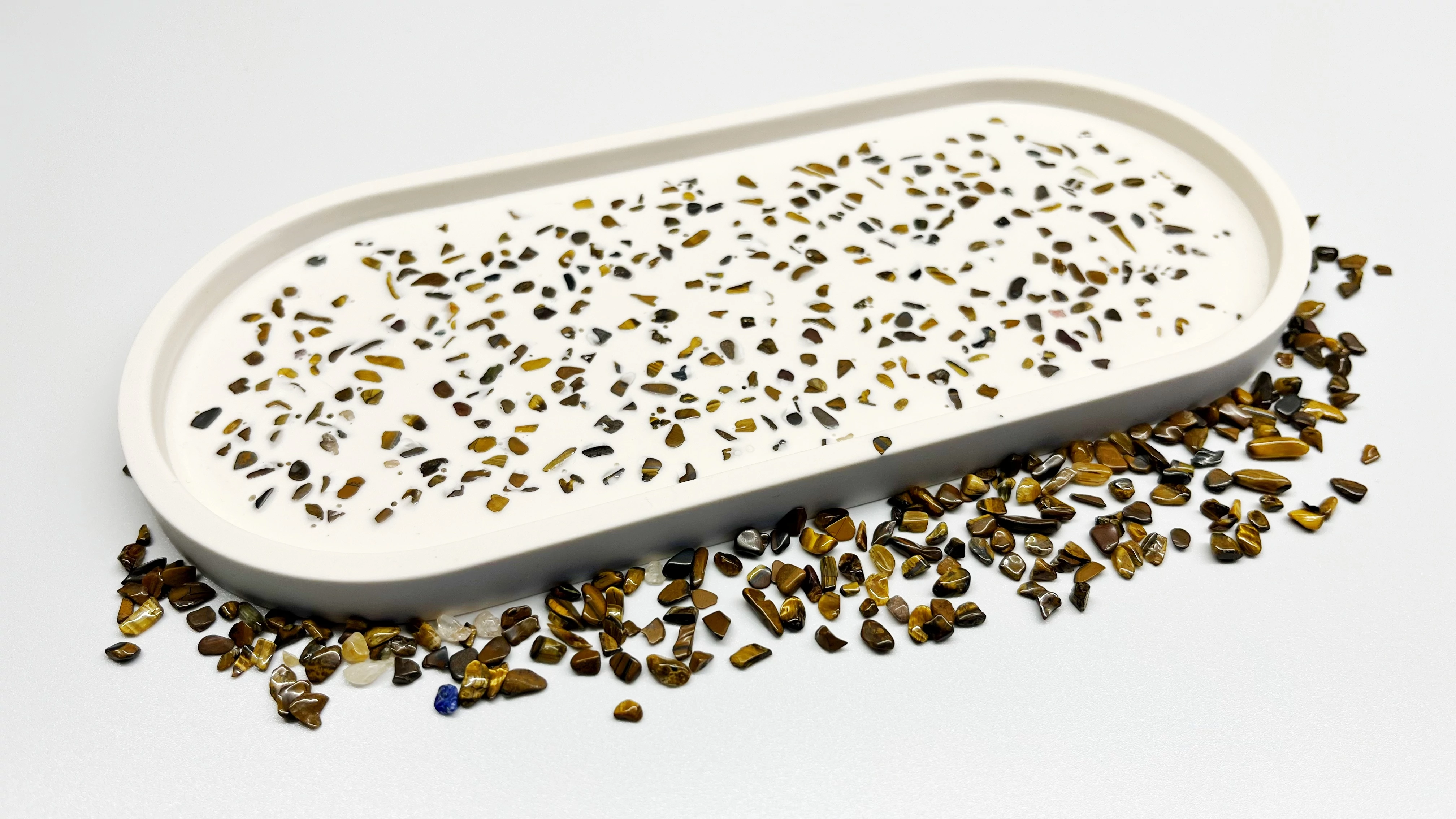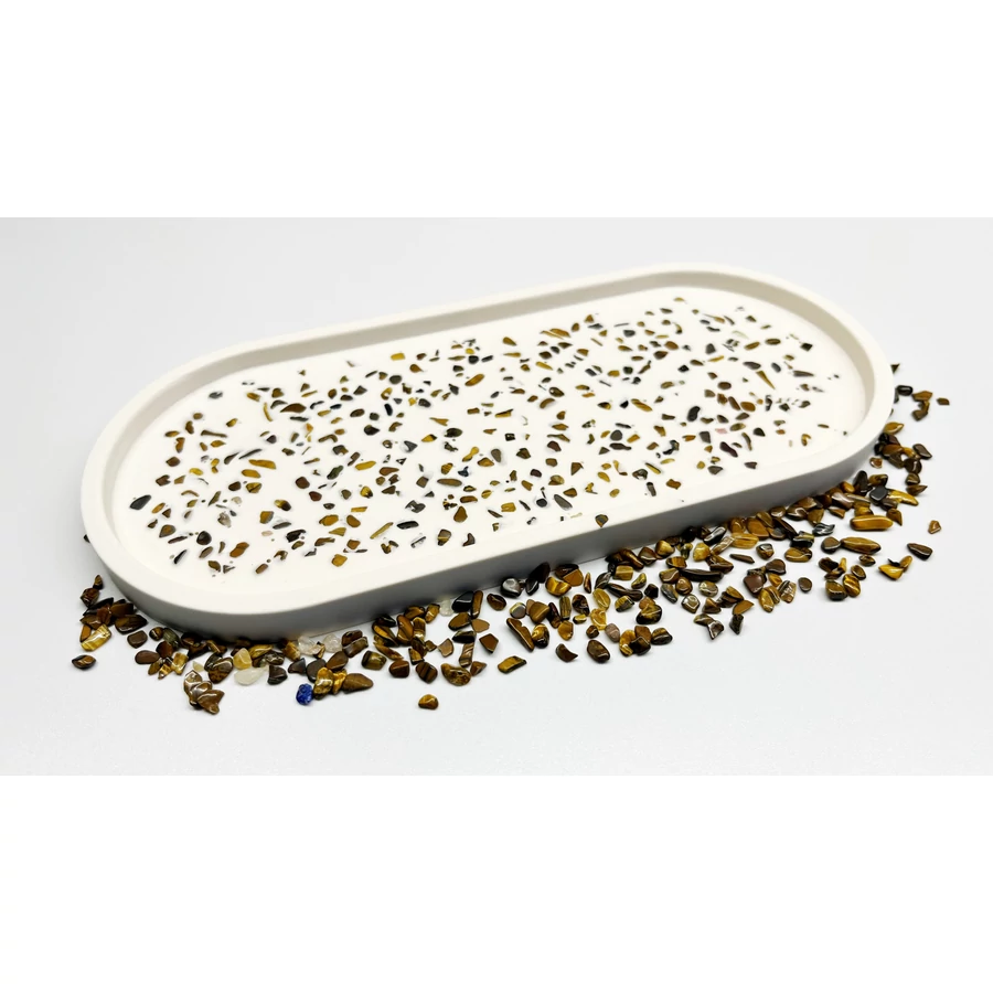 Ennek az elegáns, egyedi tálcának a különleges díszítését a tigrisszem ásvány adja. Nem csupán esztétikai élményt nyújt, hanem a természet különleges energiáit is magában hordozza. A tigrisszem ásványnak erős hatást tulajdonítanak. Úgy tartják, hogy segíthet az érzelmi elakadások feloldásában, elősegítheti a stressz csökkenését, erősítheti az idegrendszert, pozitívan hathat a csontokra és ízületekre.